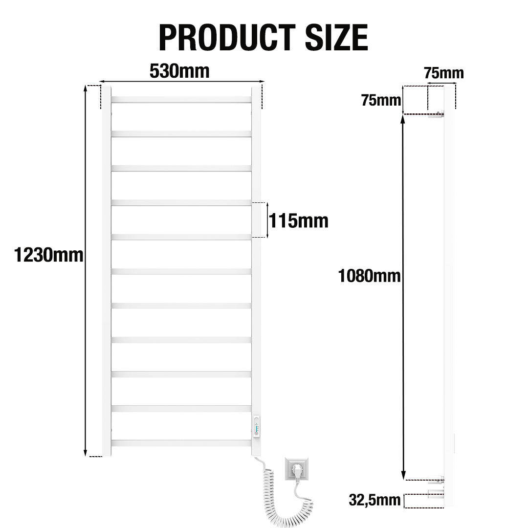 The electric towel warmer includes a temperature regulator with three adjustable heat modes and a built-in timer function. In TIMER 3H mode, the unit automatically shuts off after three hours of operation for added safety and energy savings. Highly energy-efficient, this electric device for bathroom consumes minimal electricity and can reduce monthly energy usage by up to 70%.