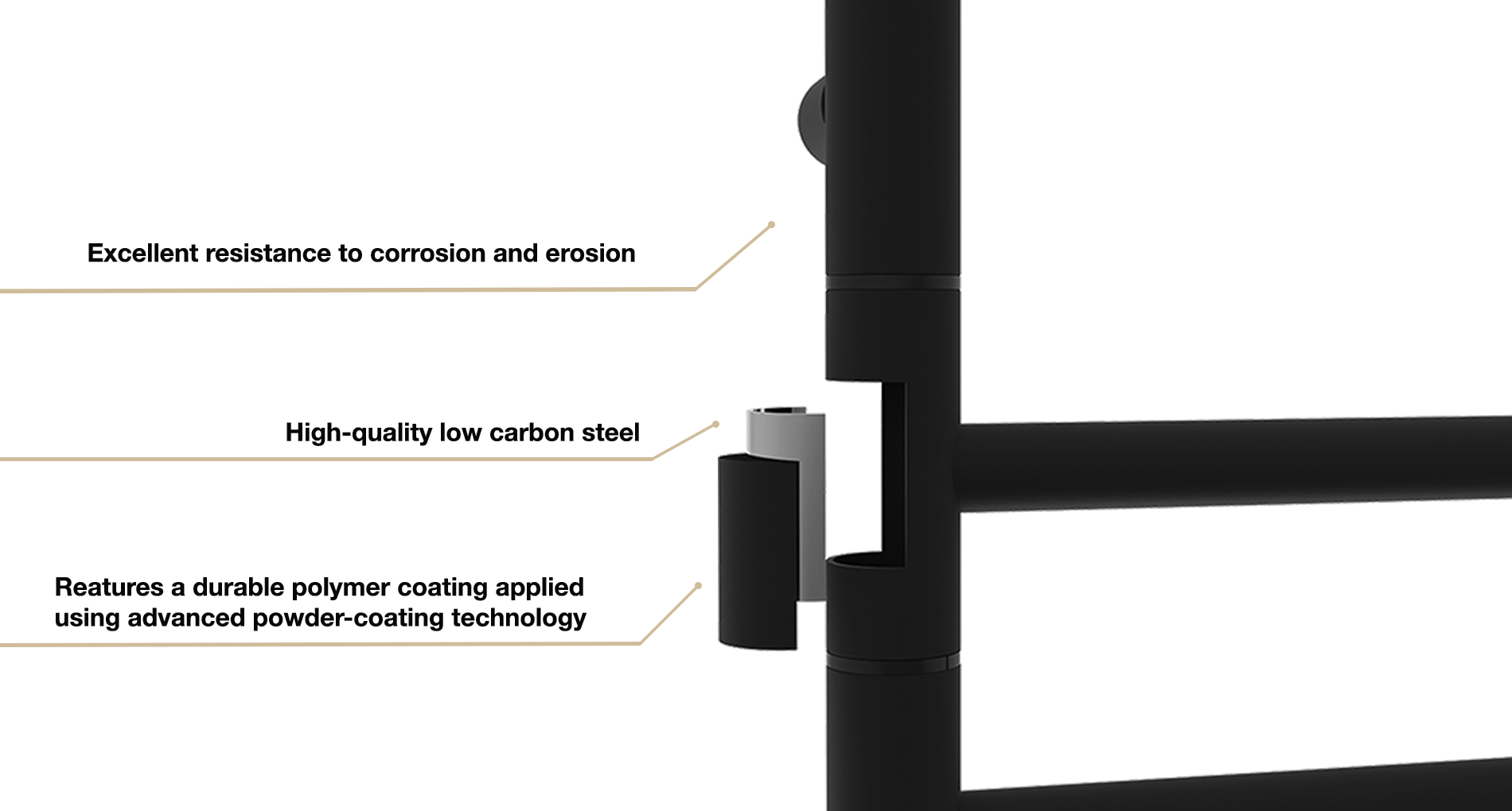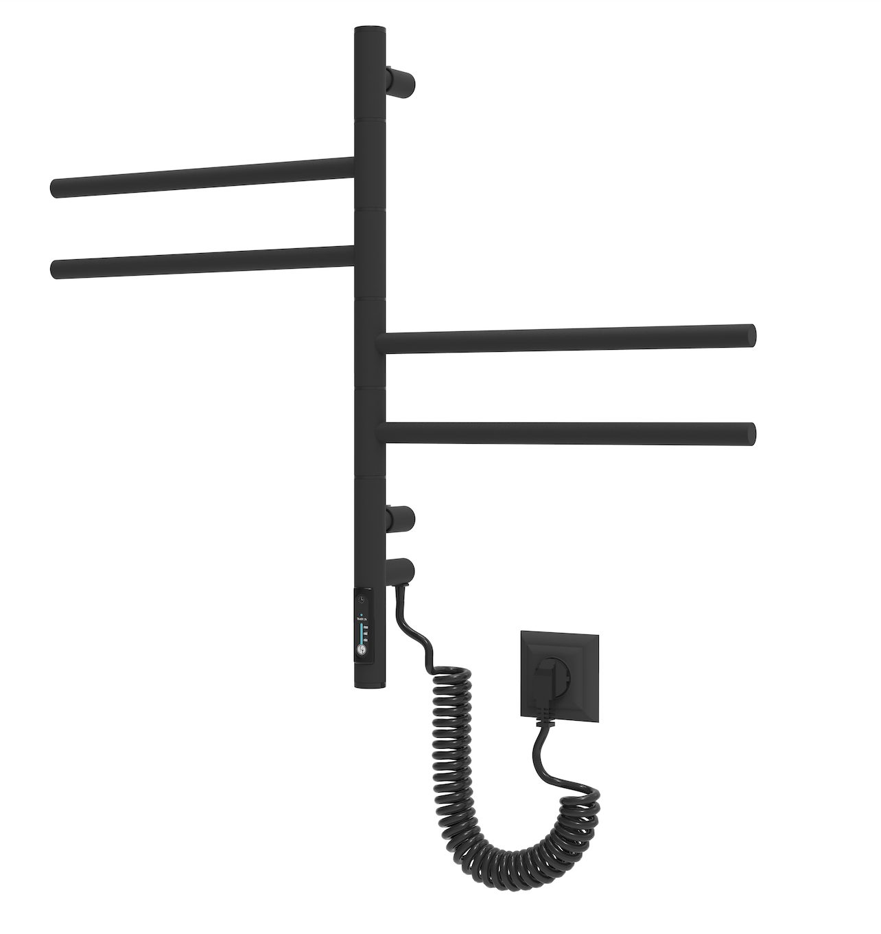 Die internationalen Trends für Innenräume im Auge behaltend, lassen Sie uns Ihnen die elektrisch beheizten Handtuchtrockner mit 180°drehbaren Elementen in einem mattschwarz. Handtuchtrockner aus Low Carbon Stahl.